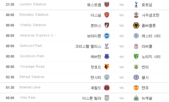 웨스트햄 vs 토트넘, 아스날 vs 사우샘프턴, 브라이튼 vs 레스터 시티, 셰필드 vs 맨유 경기가 생중계로 무료 시청이 가능합니다.