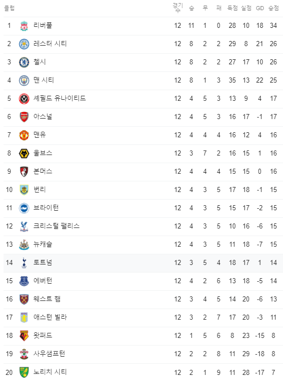 1위부터 4위까지 UEFA 챔피언스리그 조별리그 진출이 걸려 있으니 많은 팀들이 상위에 올라가기 위해 많은 노력을 하고 있는 현 상황에서 익숙하지 않은 자리에 올라간 팀들이 눈에 많이 보이고 있습니다. 가장 대표적인 팀이 바로 레스터 시티가 될 것입니다. 현재 2위를 달리고 있습니다. 8승2무 2패를 기록하고 있으며 승점 26점으로 1위인 리버풀에 승점 8점이 뒤져 있습니다. 그리고 또 한팀 바로 손흥민이 속한 토트넘이 되겠습니다. 12라운드가 진행된 현 시점에 3승 5무 4패를 기록하며 리그 14위입니다.