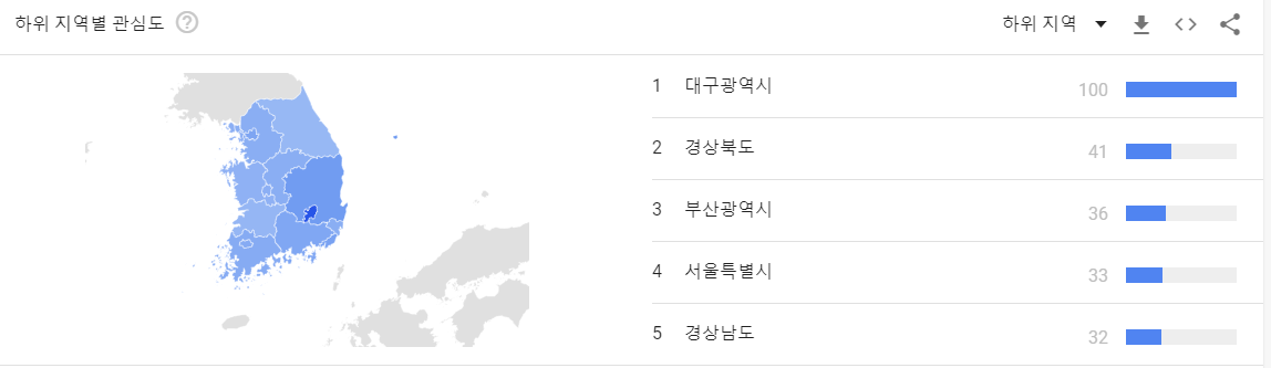 대구에서 벌어진 사건이라 대구시에서 검색량이 월등히 많은 상태이다.