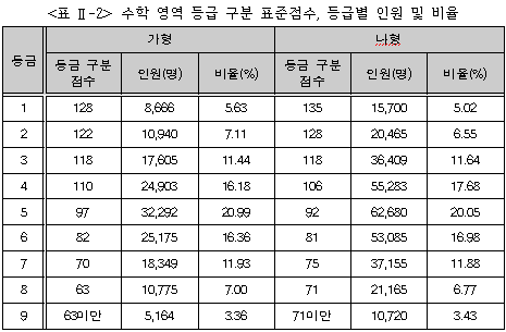 ◦ 수학 영역의 경우 가형 128점, 나형 135점으로 나타났다.