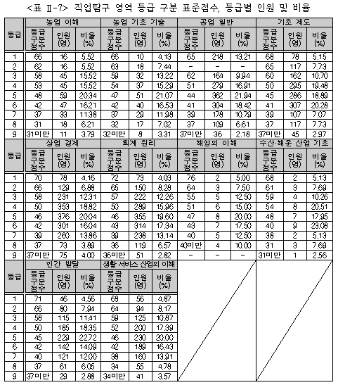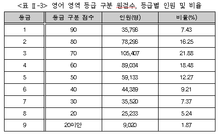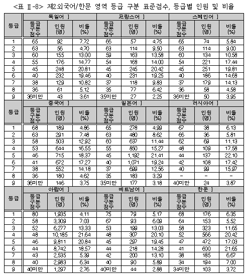 영역별 1등급과 2등급을 구분하는 등급 구분 표준점수는 다음과 같다.