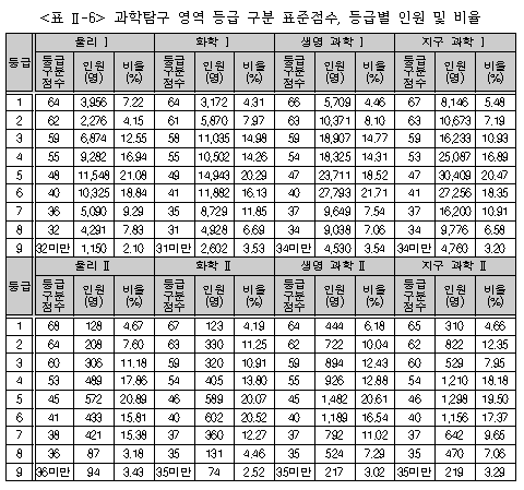 ◦ 과학탐구 영역의 경우 과목에 따라 64점~68점으로 나타났다.