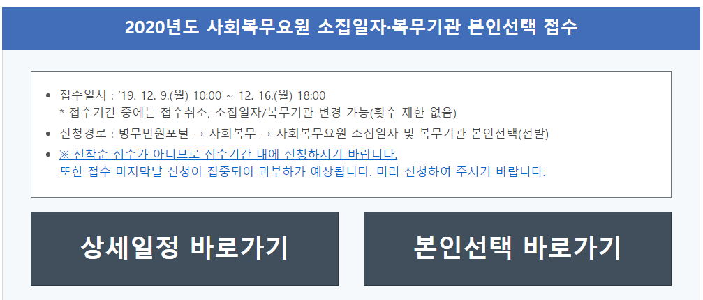 2020년 소집일자 복무기관 본인선택 접수 안내