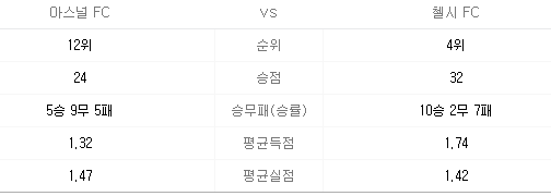 현재 첼시는 홈 5경기에서 4승 1무로 강한 면모를 보이고 있는 만큼 아스날은 더 힘든 경기가 예상되는 상황입니다.
