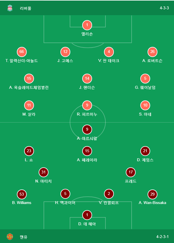 맨유는 4-2-3-1 다비드 데헤아, 아론 완비사카, 빅토르 린델로프, 루크쇼, 해리 매과이어, 브랜든 윌리엄스, 네마냐 마티치, 프레드, 안드레이스 페레이라, 다니엘 제임스, 앙토니 마시알로가 선발명단입니다.