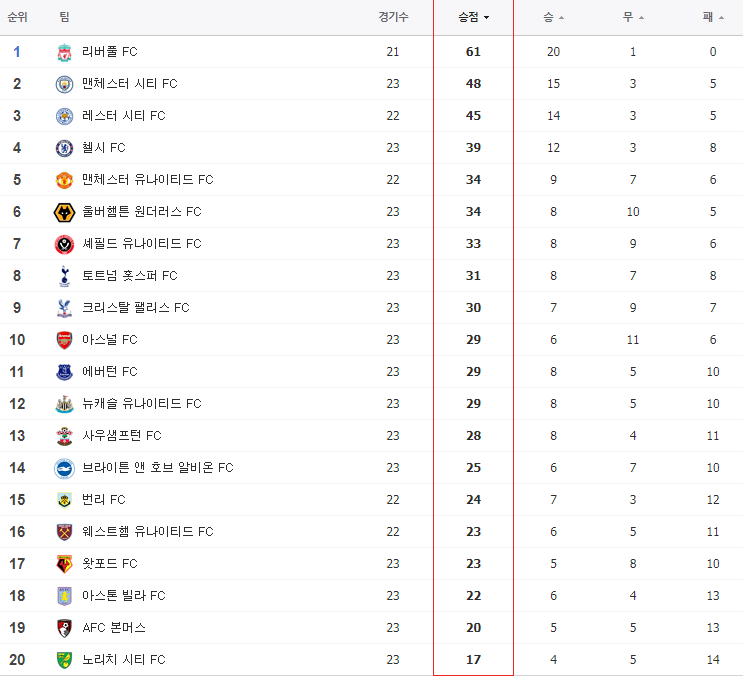 현재 리버풀은 시즌 무패 20승 1무로 승점 61점으로 프리미어리그 압도적인 1위를 기록하고 있습니다.