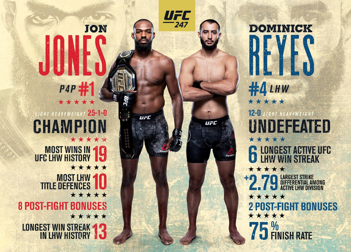 2월 9일 UFC 247에서는 UFC 라이트해비급 챔피언 존 존스(33, 미국)과 도미닉 레예스(30, 미국)의 메인 이벤트가 열립니다. 악마의 재능이라 불리는 존존스는 현재 25승 1패 1무효의 화려한 전적을 자랑합니다. 2011년 2월 UFC 128에서 마우리시오 쇼군을 TKO로 이기고 라이트 해비급 챔피언에 오른 이후 타이틀 방어를 8차까지 성공시킨 존존스 선수입니다.