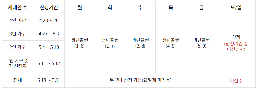 4인 이상의 경우 4월 20일~26일, 3인 가구의 경우 4월 27일~ 5월 3일, 2인 가구 5월4~10일, 1인 가구와 미신청 가구 등 나머지 전체는 5월18일부터 7월31일까지입니다.