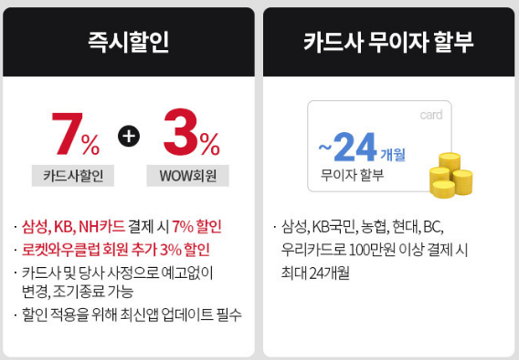 7% 카드사할인, WOW회원 추가 3%할인 - 삼성, KB, NH카드 결제 시 7% 할인 및 로켓와우클럽 회원 추가 3%할인
