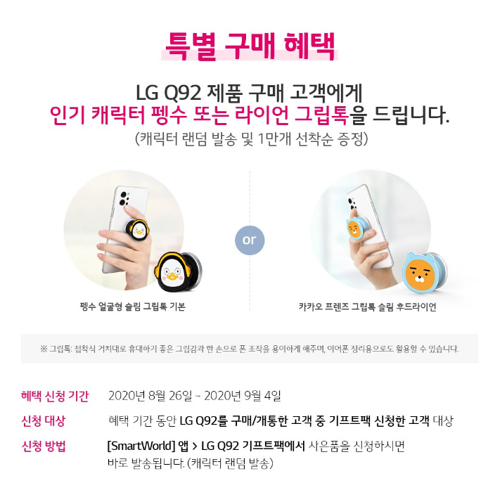 신청방법: SmartWorld 앱 ->LG Q92 기프트팩에서 사은품을 신청하면 됩니다(캐릭터 랜덤 배송)