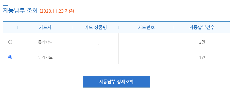 자동납부조회 후 카드사를 선택 "자동납부상세조회"를 클릭하시면 요청한 카드사의 자동납부 내역 조회를 즉시 확인하실 수 있습니다.