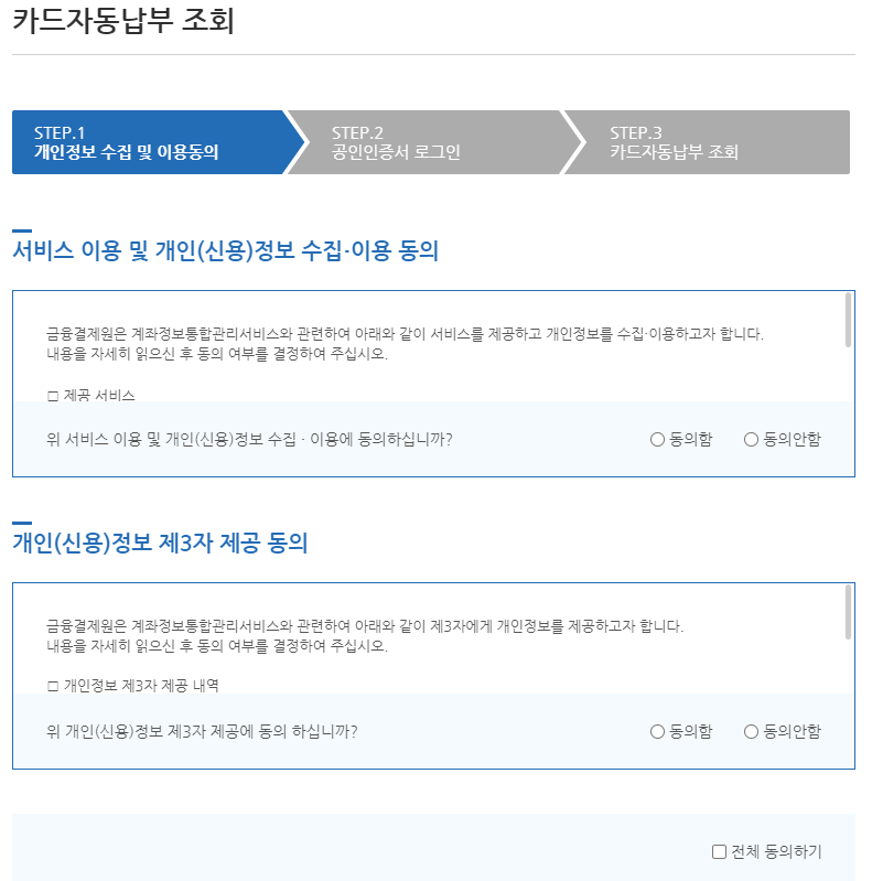 "카드자동납부통합관리"에 접속합니다. 개인정보 수집 및 이용동의->공인인증서 로그인->카드자동납부 조회 절차에 따라 진행합니다.