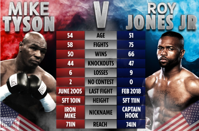 이번 경기 파이팅 머니는 타이슨이 약 110억, 로이 존스 주니어가 33억원으로 알려졌습니다. 타이슨은 현역 시절 통산 50승 2무 6패를 기록 이중 50차례 승리에서 44경기를 KO로 이겼으며 24번을 1라운드에 KO승을 거두었습니다. 20살의 나이에 세계 헤비급 챔피언 벨트를 획득 최연소 세계 헤비급 챔피언이 되었습니다. 마이크 타이슨의 마지막 경기는 2005년 케빈 맥브라이드와 대결 이후 15년 만에 링 위에 오르게 됩니다.