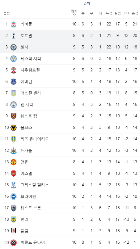 토트넘은 6승2무 1패로 승점 20점 리버풀에 승점 1점 뒤진 2위를 기록하고 있으며 첼시의 경우 5승 3무 1패로 승점 18점 리그 3위에 올라 있습니다. 리그 2위와 3위간의 격돌입니다. 월요일 새벽시간이지만 시청하지 않을 수 없군요.