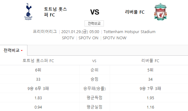 토트넘은 오는 29일 오전 5시(한국시간) 런던의 토트넘 홋스퍼 스타디움에서 리버풀과 2020-2021 프리미어리그 20라운드 홈 경기를 치릅니다. 선두 경쟁을 벌이던 토트넘이 지금은 9승 6무 3패 승점 33점으로 리그6위로 내려 앉았으며 디팬딩 챔피언 리버풀은 9승 7무 3패 승점 34점 리그 5위입니다. 1위는 맨체스터 시티(승점41)와 승점 7점차로 상위 탈환을 위해 리버풀전 승점 3점은 꼭 필요한 상황입니다.