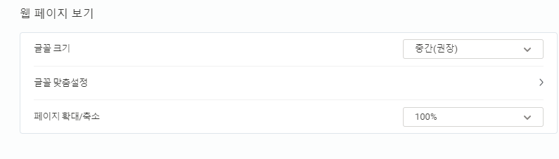 해당 페이지에서 글꼴크기와 글꼴 맞춤설정, 페이지확대/축소를 자유롭게 설정할 수 있습니다.