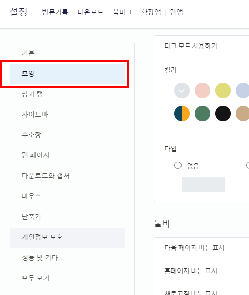 "모양"을 선택하시면 다양한 설정을 변경하실 수 있습니다.
