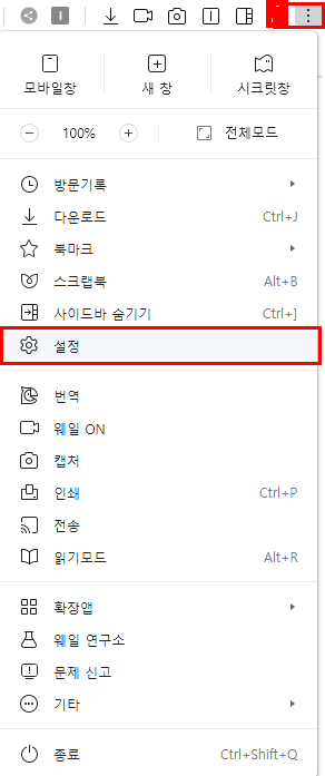 웨일, 크롬 등은 다양한 설정을 개인설정을 통해 편안하게 할 수 있어 오히려 어려워 하시는 분들이 많습니다. 하지만 꼭 필요한 기능은 설정에 들어가면 전부 확인하실 수 있으니 꼭 한번 어떤 설정이 있는지 확인해 보세요.