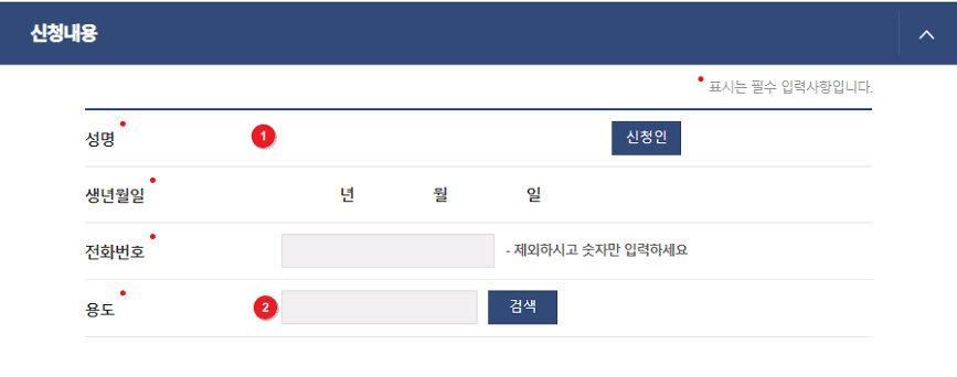 신청인 버튼을 클릭하여 신청인의 기본정보를 자동입력