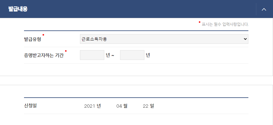 증명받고자하는 기간은 민원을 신청하는 이전 년도 선택
