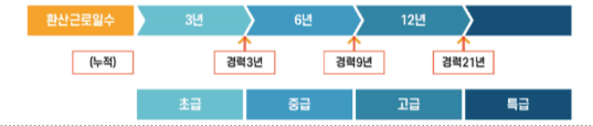 건설근로자 기능등급제도는 건설근로자의 객관적으로 검증된 이력을 종합적으로 산정한 환산경력을 기준으로 초・중・고・특급의 4단계 등급을 부여