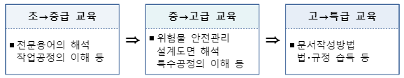 ㅇ 승급교육은 등급별로 갖춰야 하는 기능역량을 확보할 수 있도록 초→중급, 중→고급 교육은 기능 중심의 실습교육으로 구성하고, 고→특급교육은 관리역량 중심으로 실시할 계획이다.