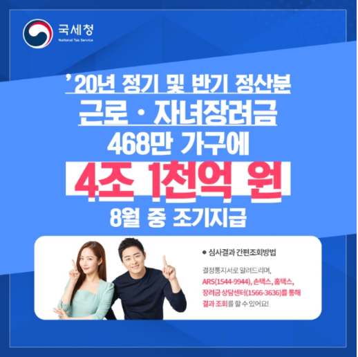 근로/자녀장려금을 법정기한인 9월30일보다 한달 이상 앞당겨 8월26일 지급합니다.