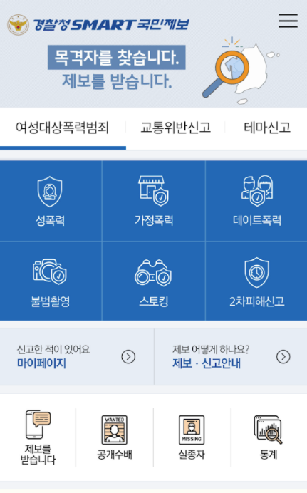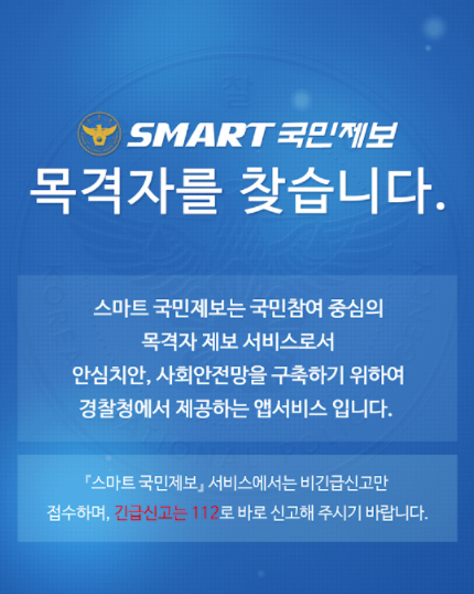 '스마트국민제보-목격자를 찾습니다'는 우리 주변에서 일어나는 각종 사건, 사고를 손쉽고 간편하게 제보할 수 있는 국민참여형 치안 안전 서비스입니다. 경찰청이 국민의 적극적이고 자발적