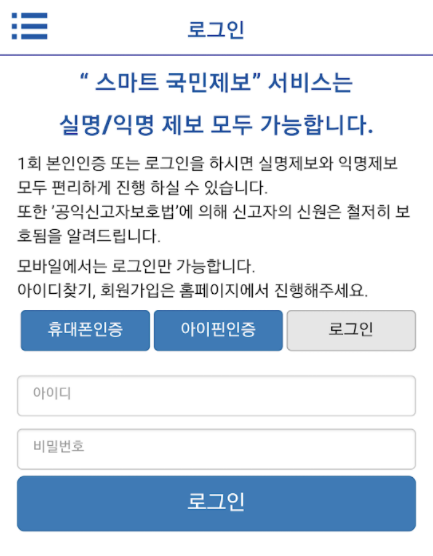 앱 신고를 하기 위해서는 휴대폰인증, 아이핀, 회원가입 중 선택하여 접속가능합니다.