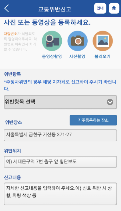 위반장소, 위반위치, 신고내용을 순차적으로 작성하여 진행하면 됩니다.