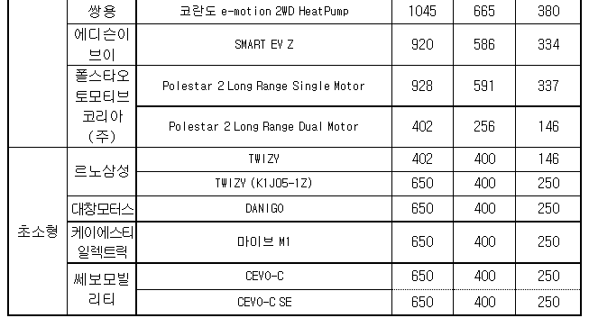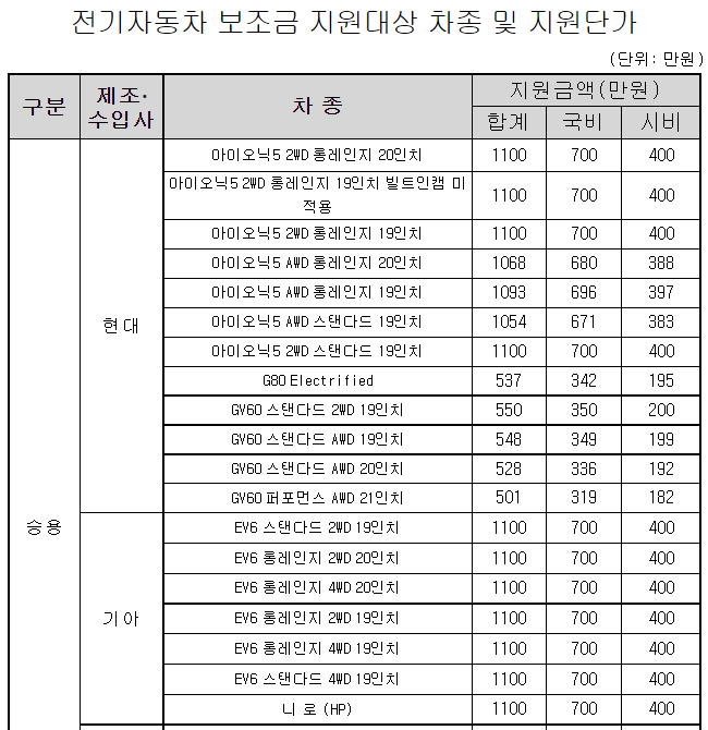 4.지원금액: 승용 402만원-1,100만원, 초소형 650만원 정액