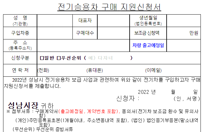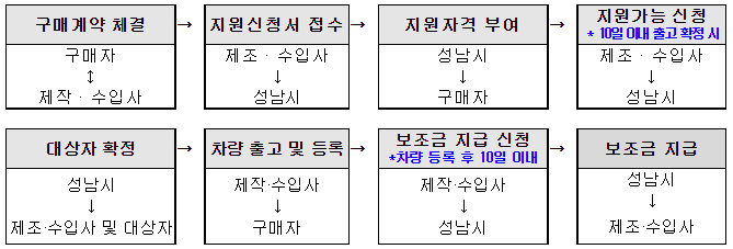 ※ 전기자동차 보조금 대상차종은 전기자동차 통합포털에서 열람할 수 있으며, 공고일 이후 환경부 보조금 지원대상으로 선정된 차량은 추가 공고 없이 성남시 보조금 지원대상에 포함됨.