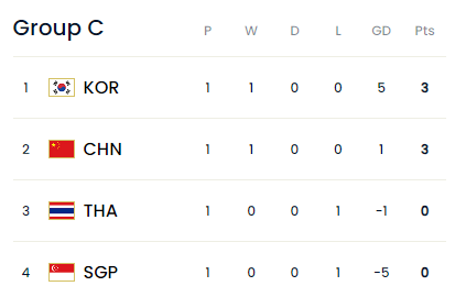 한국은 지난 16일 서울월드컵 경기장에서 열린 C조 1차전 싱가포르를 상대로 5-0 승리를 거둬 현재 조 1위를 달리고 있으며 중국은 태국을 상대로 2-1 역전승을 기록 골득실에서 한국이 앞선 상황입니다.