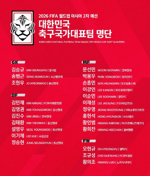 2026년 북중미 월드컵 2차 예선 중계 SBS는 배성재, 장지현, 하석주 해설위원으로 나서고 쿠팡플레이는 윤장현 캐스터와 한준희 해설위원, KBS 2TV 의 경우 남현종 캐스터 이영표 위원의 해설로 중계방송됩니다.