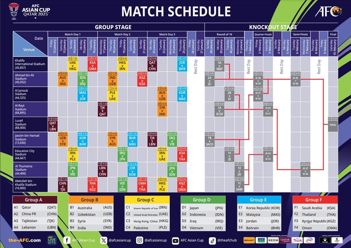 카타르 아시안컵 대회기간 2024년 1월 12일 금요일 ~ 2월 10일 일요일