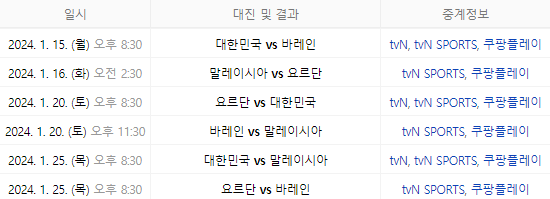 위르겐 클리스만 감독이 이끄는 한국 남자 축구대표팀은 6일 토요일 이라크와 아랍에미리트 아부다비의 뉴욕대 스타디움에서 마지막 평가전 이후 12일 개막하여 15일 월요일 한국 대 바레인, 20일 대한민국 대 요르단, 25일 목요일 대한민국 대 말레이시아와 경기를 한국시간 오후 8시 30분부터 생중계로 TV, 인터넷, 모바일을 통해 경기를 시청하실 수 있습니다.
