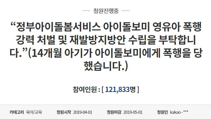"정부아이돌봄서비스 아이돌보미 영유아 폭행 강력 처벌 및 재발방지방안 수립을 부탁합니다.”