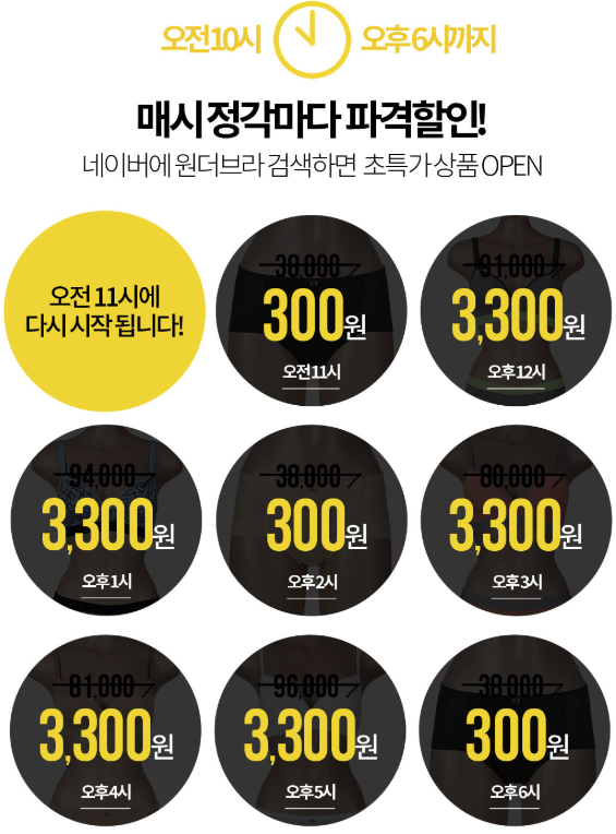 원더브라는 오전 10시부터 오후 6시까지 매시각 정각에 파격할인을 진행한다.