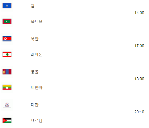괌 대 몰디브 오후 2시 30분부터 12경기를 한다. 여기에는 베트남 대 태국의 경기가 포함되어 있다