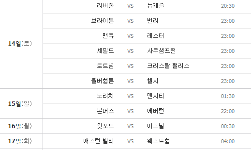 이외 브라이튼 대 번리, 세필드, 사우샘프턴, 울버햄튼 대 첼시, 노리치 대 맨시티, 에스턴 빌라 대 웨스트햄