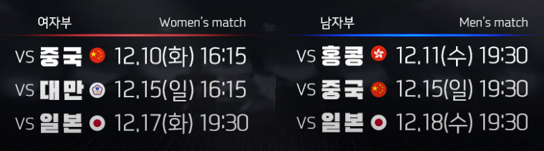 12/17 (화요일) 16:15 대만 : 중국, 19:30 대한민국 : 일본