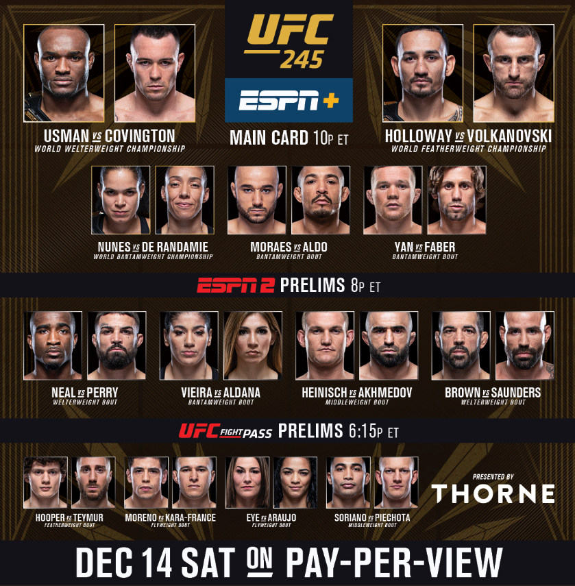 UFC 245 메인카드 경기는 12월 15일 (일요일) 낮12:00 부터 생중계 됩니다. 경기 시간 참고하세요.