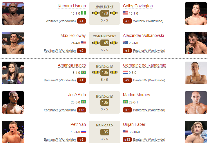 우스만 VS 코빙턴, 할로웨이 VS 볼카노프스키, 누네스 VS 드란다미 선수까지 역대급 대결이 벌써 기대됩니다.