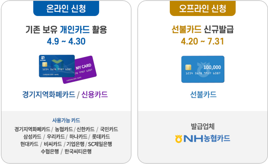 지급방식 - 경기지역화폐카드는 10만 원 충전 신용카드는 사용액에서 자동차감 청구/선불카드 신청 후 지급되어 사용하시면 됩니다.
