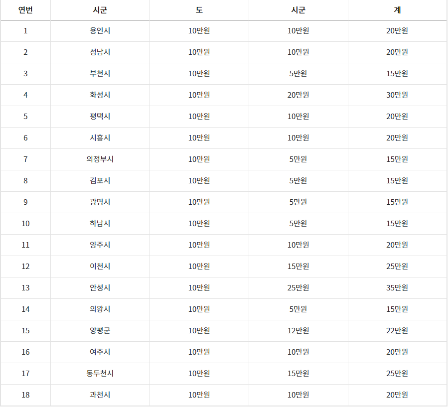 나머지 13개 시군*은 시군에서 자체적으로 지급예정이므로, 시군으로 문의.(나머지 13개 시군* : 수원, 고양, 안산, 안양, 파주, 광주, 군포, 오산, 포천, 가평, 연천, 구리, 남양주)