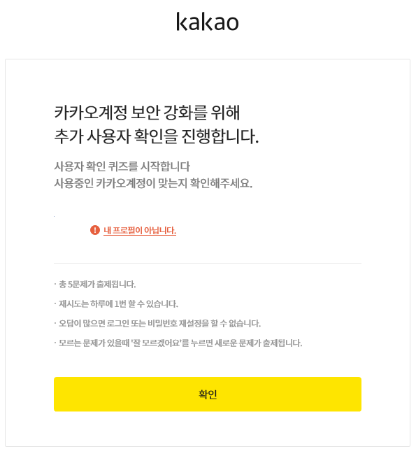 비밀번호를 주기적으로 변경해야 한다라는건 누구나 알고 있습니다. 하지만 그게 쉬운건 아니죠. 오늘은 저도 위와 같이 카카오계정이 보호조치 상태입니다. 라는 카톡을 받고 해제를 했습니다. 해제 방법은 본인인증 절차를 거치고 카카오톡 프로필 사진 5장을 맞춘 다음 비밀번호 재설정을 할 수 있었습니다. 휴대폰 카카오톡은 로그아웃 되지 않았기에 친구들의 프로필 사진을 전부 맞출 수 있었네요. ㅎㅎ