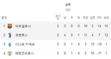 메시는 이번 시즌 7골을 기록하고 있으나 이 중 5골이 페널티킥입니다. 호날두는 이번 시즌 10골을 넣고 있습니다. 현재 챔피언스리그 G조 순위는 바르셀로나가 5승 무패 승점 15점으로 1위를 달리고 있으며 유벤투스는 4승 1패 승점 12점으로 2위입니다.