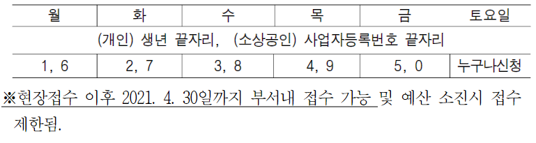 대면(현장)접수는 3월 1일부터 한 달간 실시하며, 개인은 출생연도(생년) 끝자리, 소상공인은 사업자등록번호 끝자리에 해당하는 요일에 거주지나 사업장 소재가 있는 관할 행정복지센터에서 접수하면 된다.