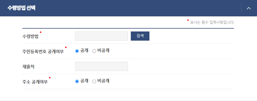 수령방법이 방문수령(후불), 온라인열람(제출기관)인 경우에는 수령/제출기관 검색버튼을 클릭하여 수령/제출기관검색창에서 수령/제출기관을 선택