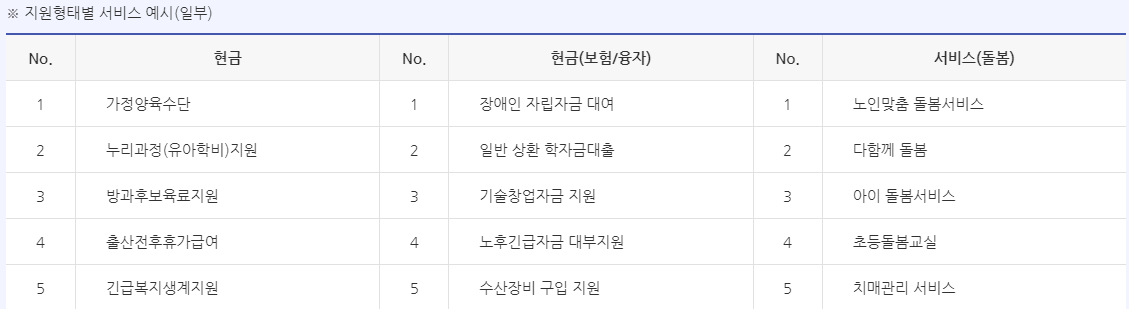 지원 형태별로 보면 현금지원(92종), 이용권(27종), 현물지원(23종) 지원이 많고 의료지원, 일자리, 돌봄 서비스도 있습니다.